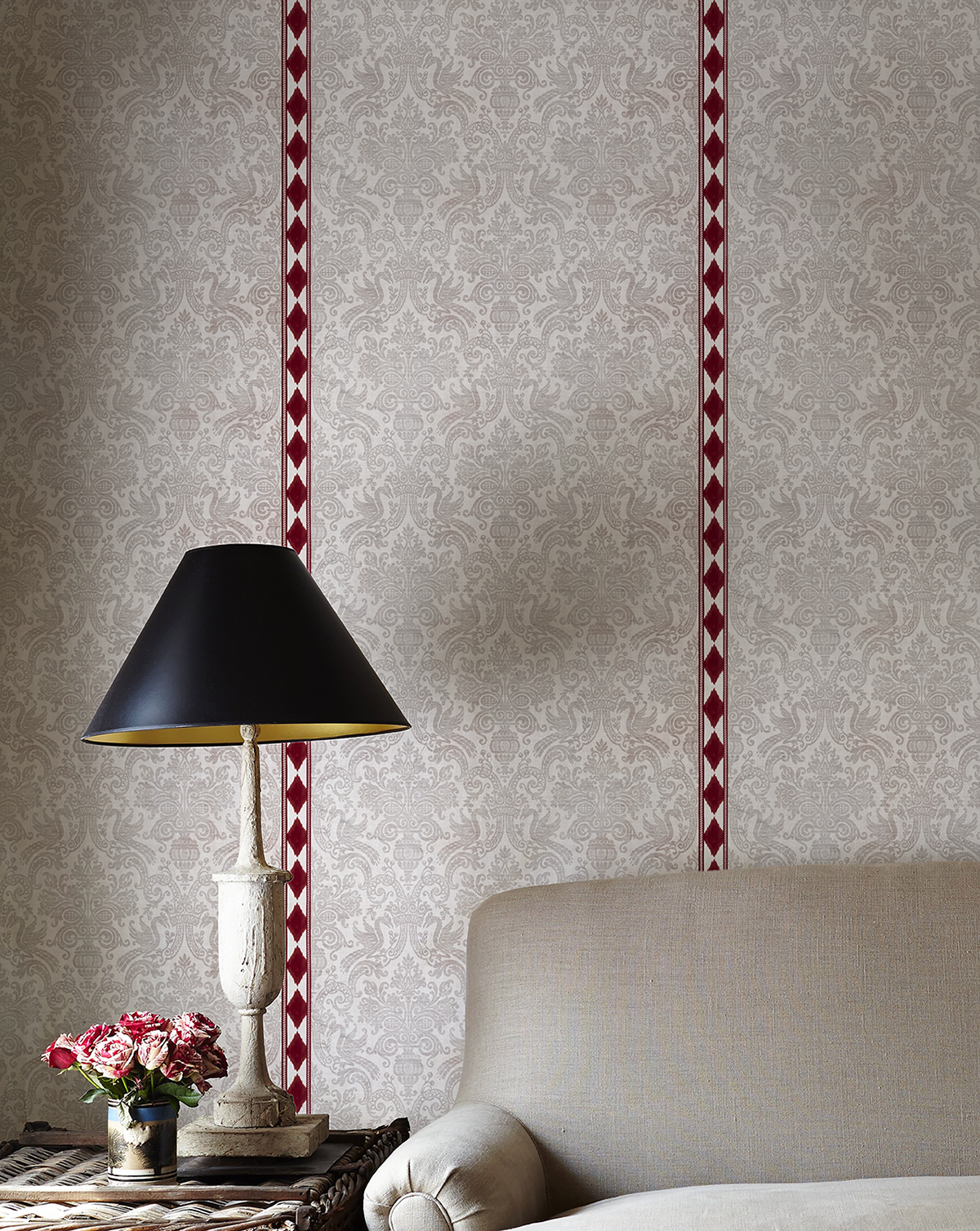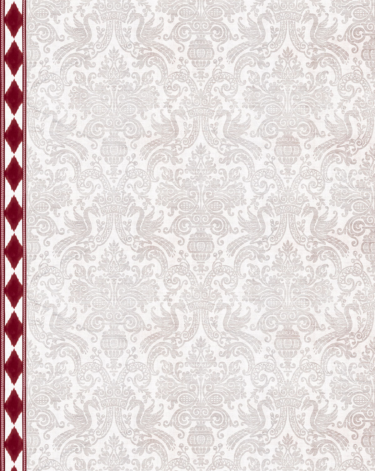CAROLINA ROJO es un papel pintado de una hermosa trama caleidoscópica de tono "greich" gris con beige, que fusiona elementos clásicos como los leones palaciegos con lo étnico, diseño en colaboración con The IQHome Collection.
