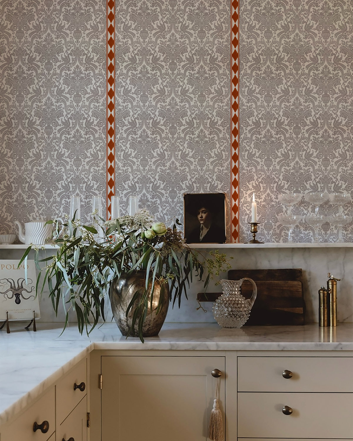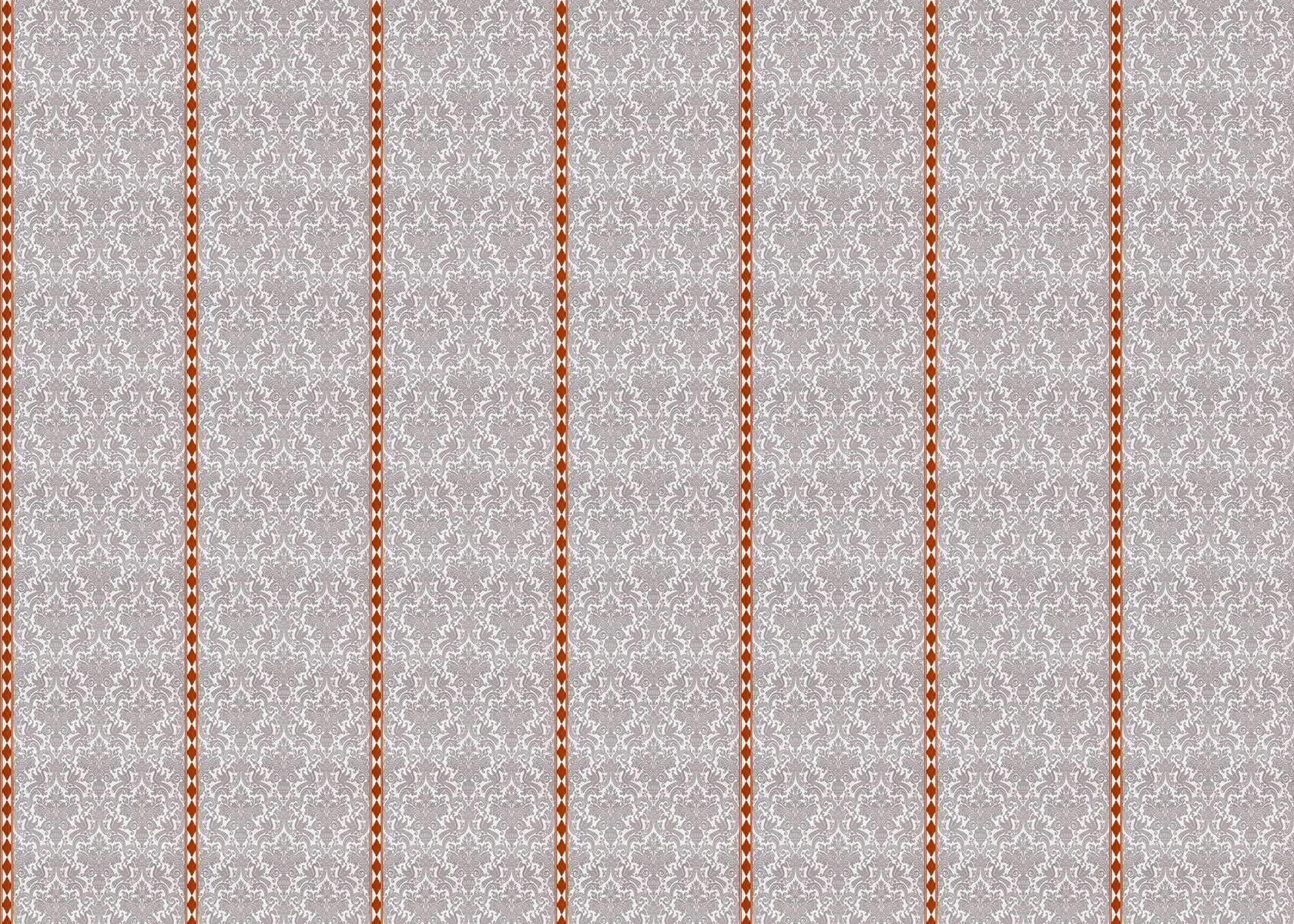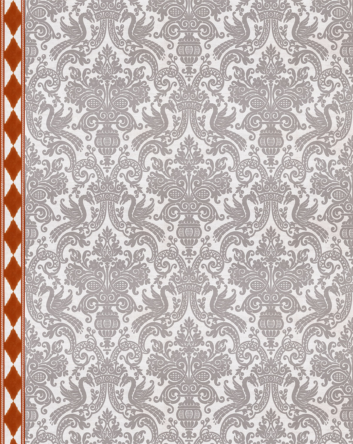 ELENA  TEJA es un papel pintado de una hermosa trama caleidoscópica de tono taupe, que fusiona elementos clásicos como los leones palaciegos con una guarda étnica diseño en colaboración con The IQHome Collection.