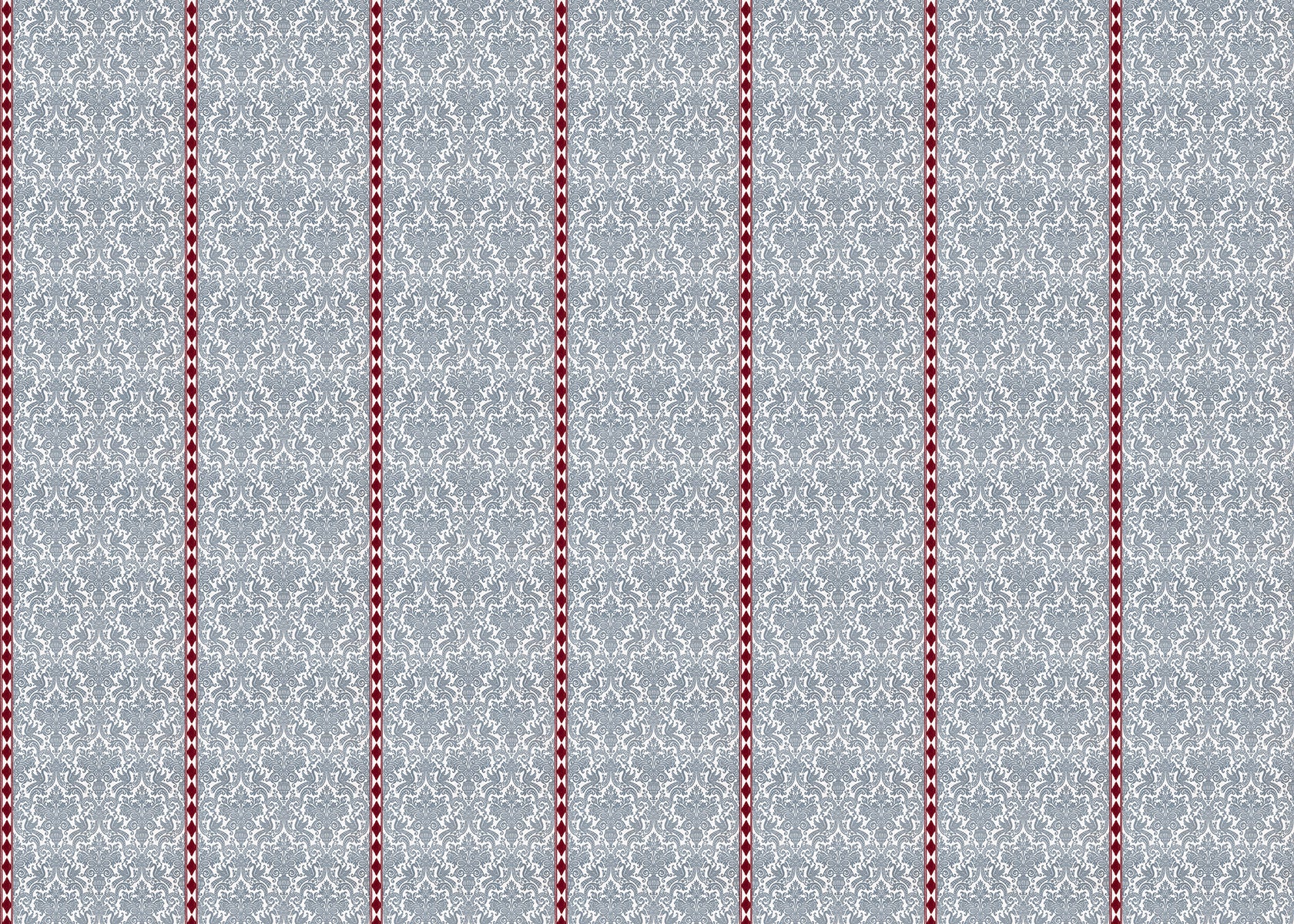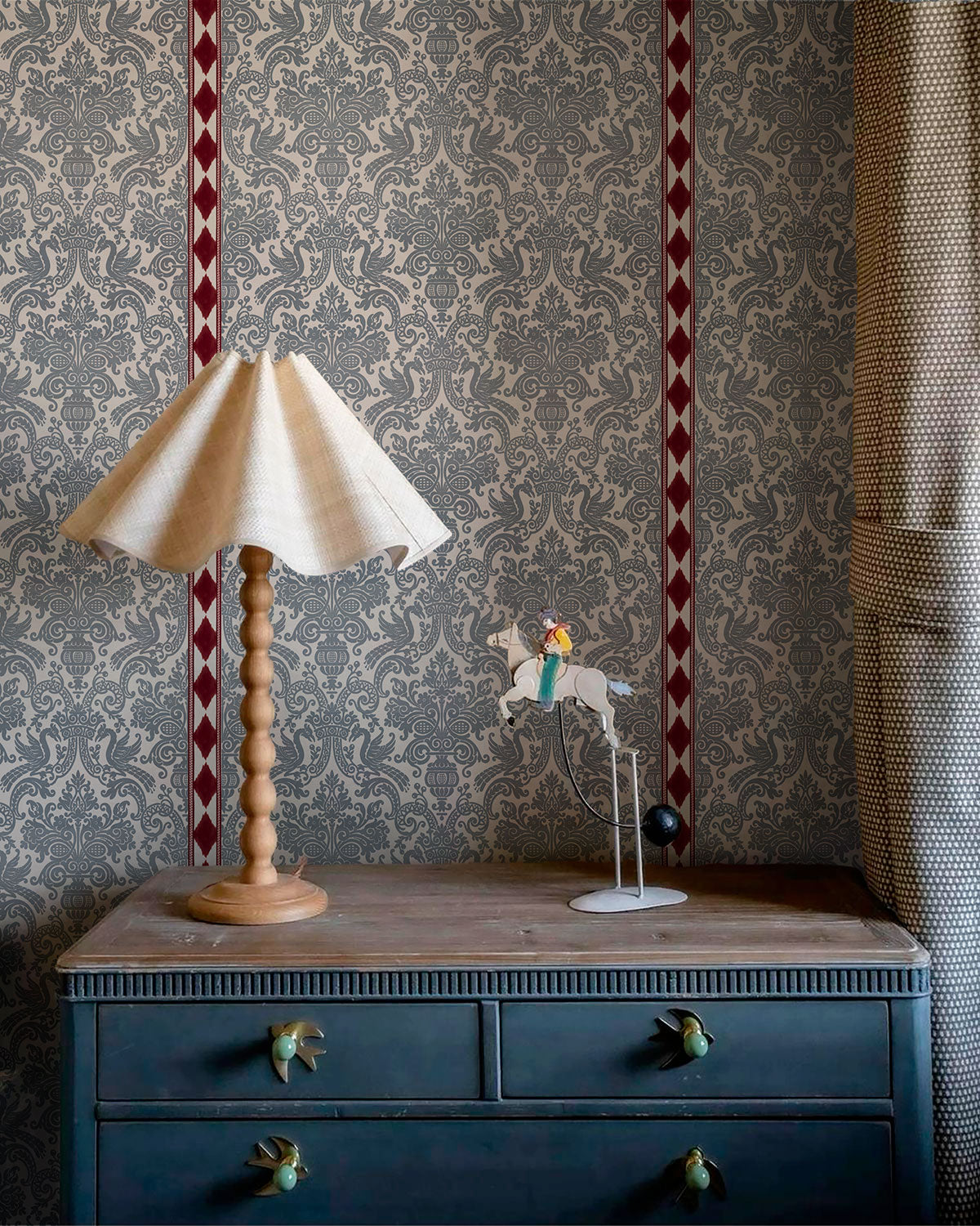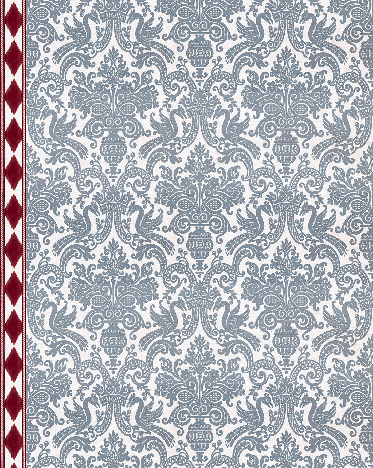 LEONOR  ROJO  es un papel pintado de una hermosa trama caleidoscópica de tono celeste, azulado, que fusiona elementos clásicos como los leones palaciegos con una guarda étnica diseño en colaboración con The IQHome Collection.