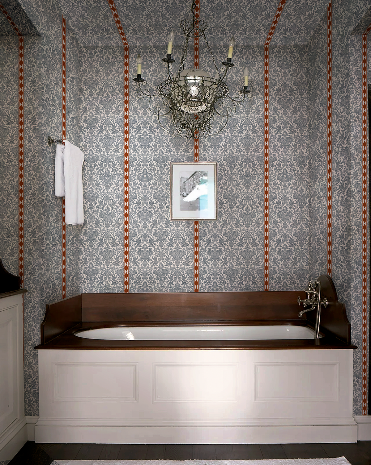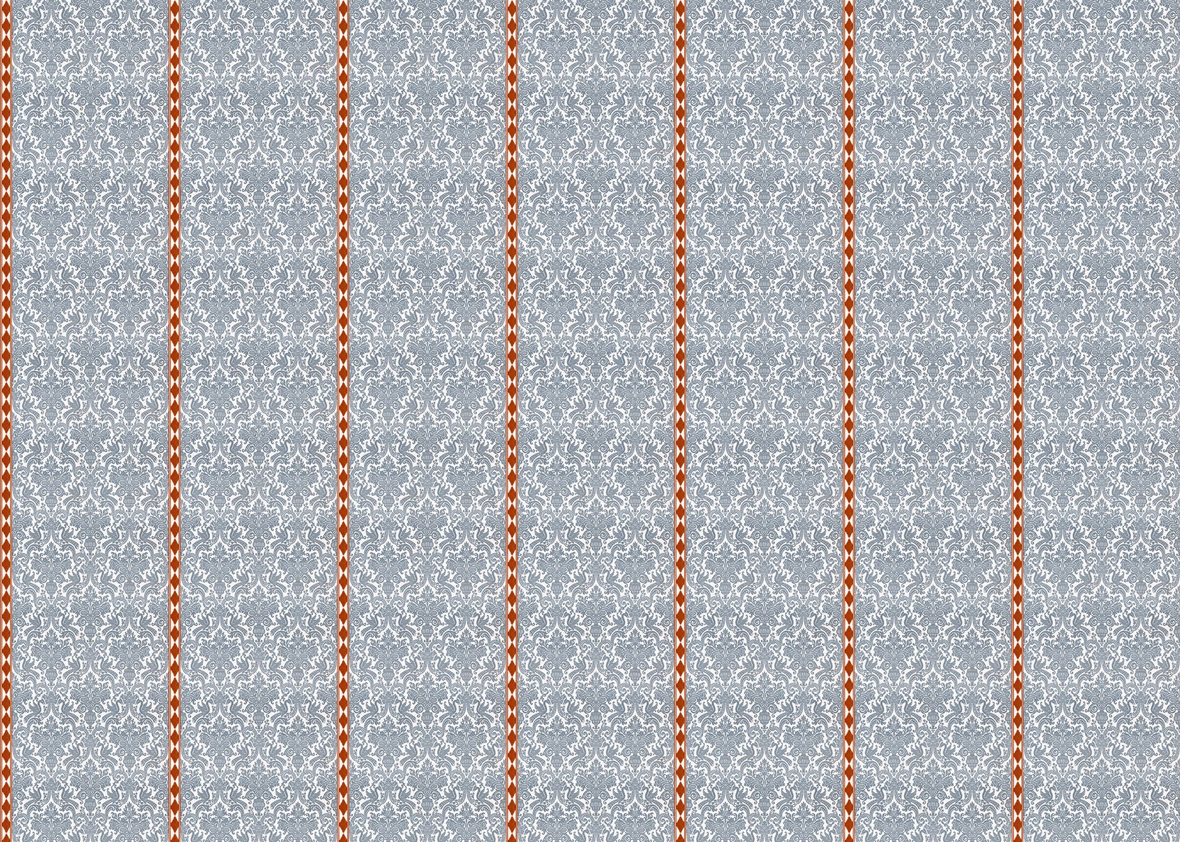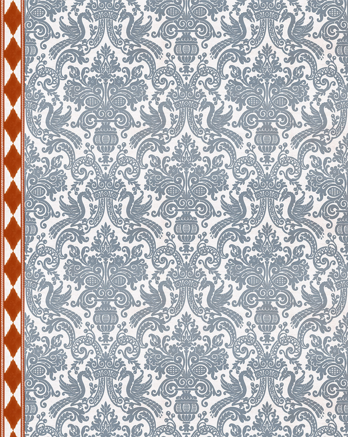 LEONOR  TEJA  es un papel pintado de una hermosa trama caleidoscópica de tono celeste, azulado, que fusiona elementos clásicos como los leones palaciegos con una guarda étnica diseño en colaboración con The IQHome Collection.