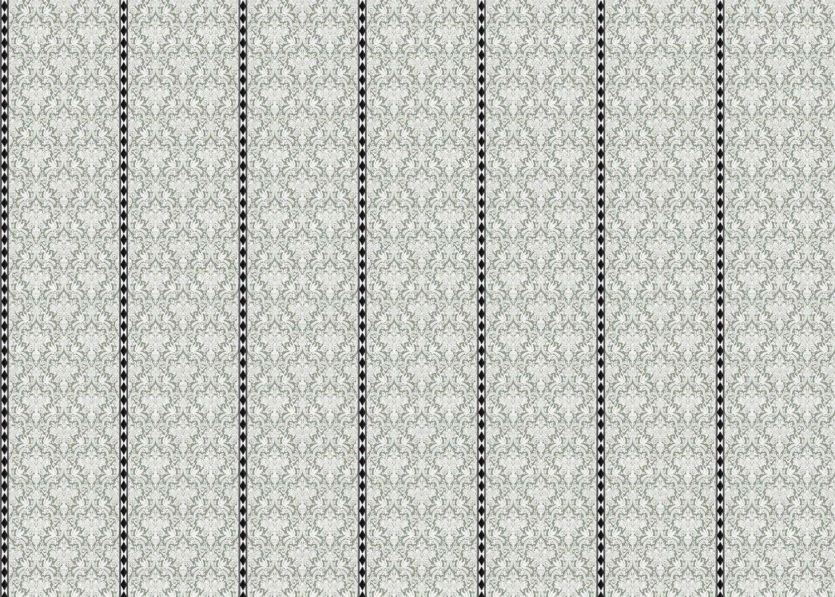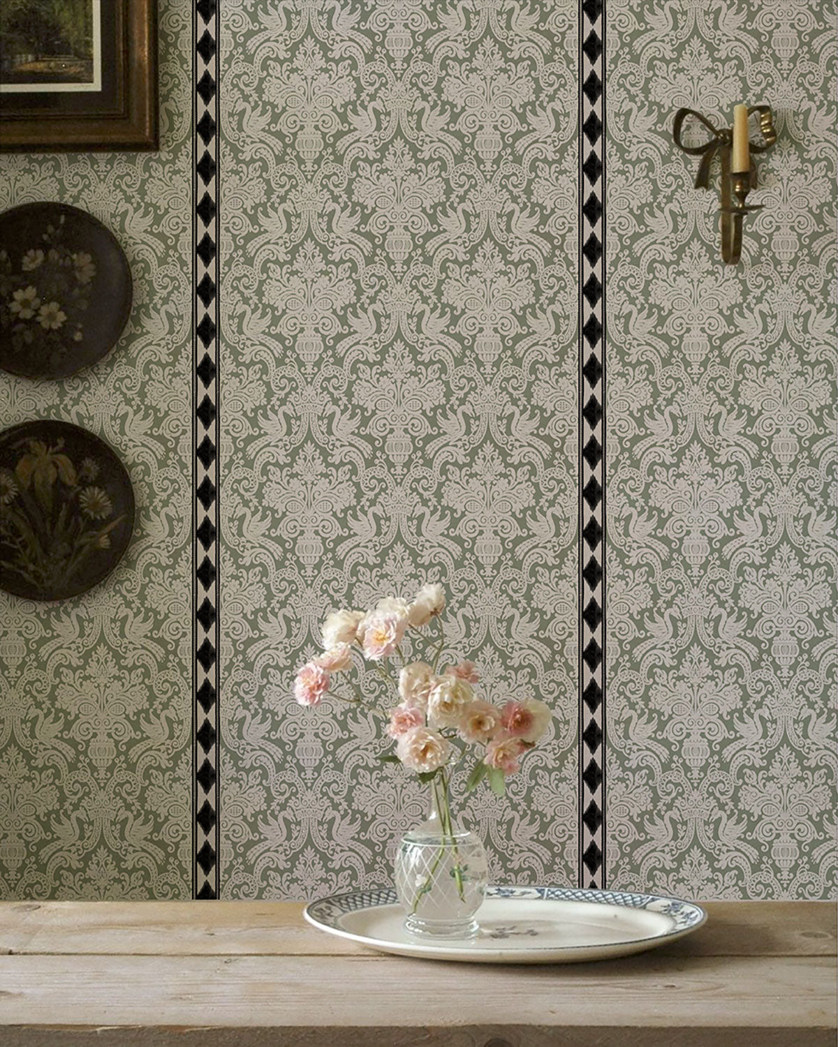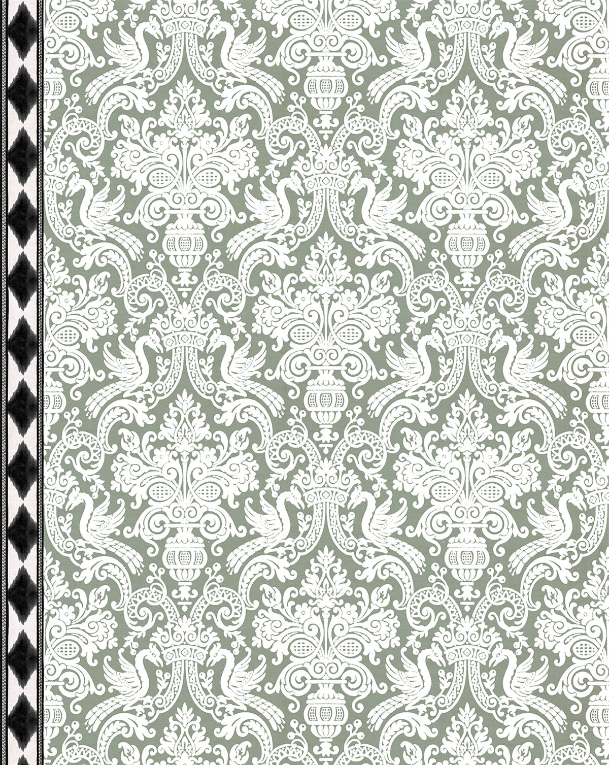 VICTORIA NEGRO  papel pintado,  patrón de estilo palaciego  en tono verde oliva, en  el que conviven guardas étnicas con una trama de leones que tejen un  figura y forma  sofisticada, moderna y atemporal a la vez , un diseño en colaboración con The IQHome Collection.
